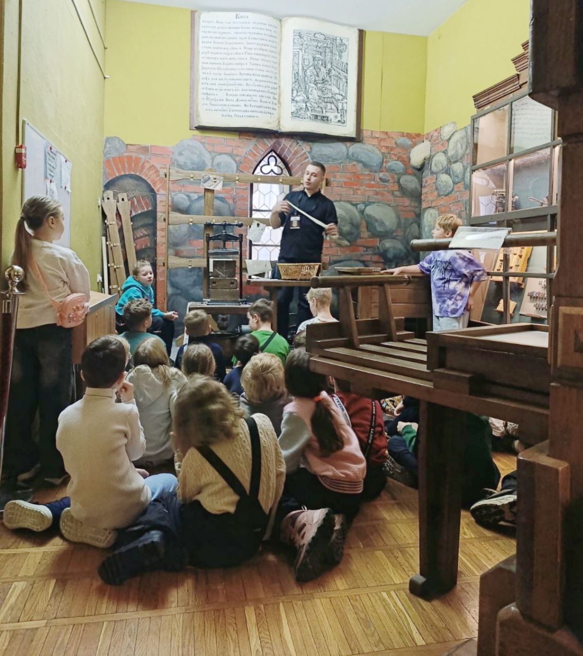 Но самое захватывающее ждало впереди! Ученики не просто узнали, как создавались древние книги, но и смогли сами прикоснуться к этому волшебству. Ребята приняли участие в настоящем мастер-классе, где на станке, воссозданном по чертежам времён самого Франциска Скорины, смогли напечатать свою собственную страницу. Это был невероятный опыт, который позволил почувствовать себя частью истории и понять, какой титанический труд стоял за созданием каждой книги в прошлом.
